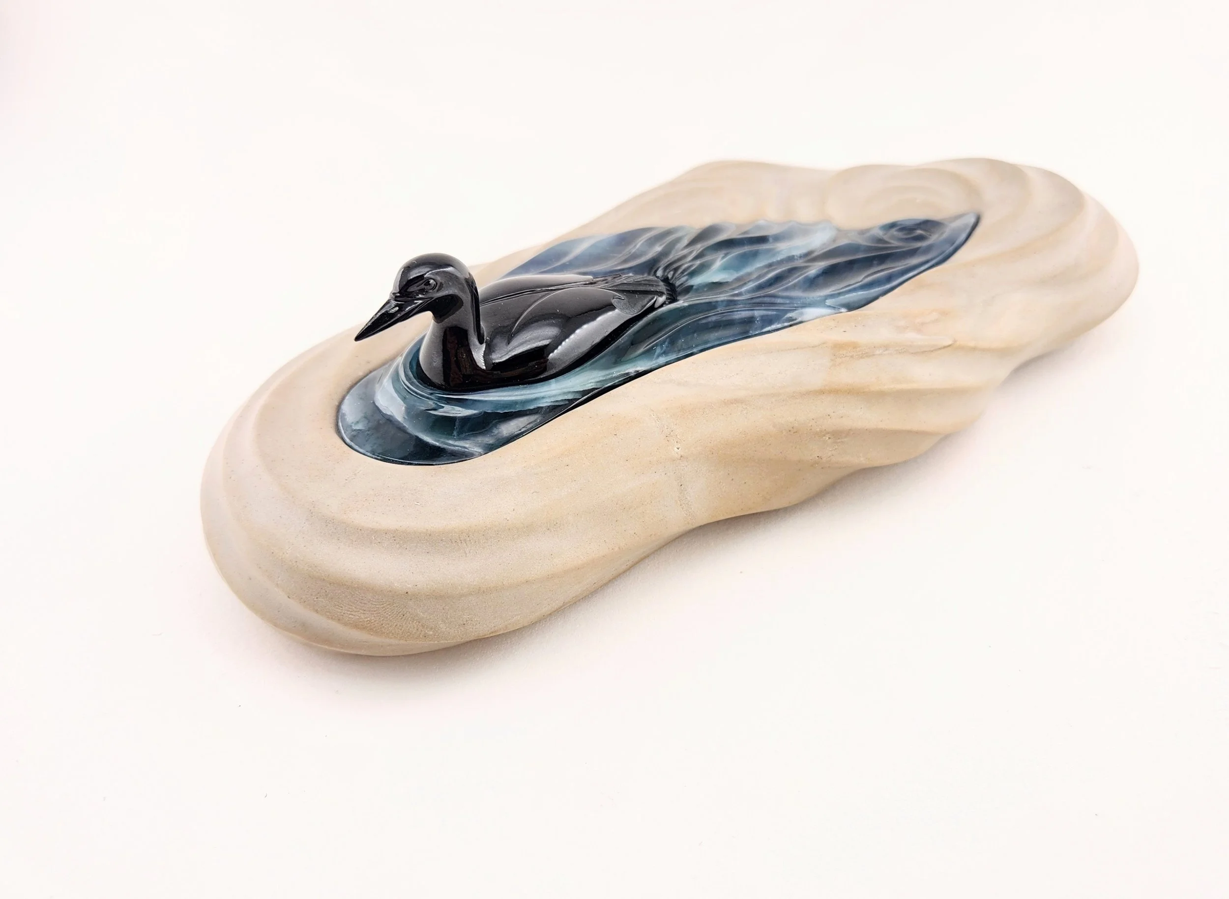 Jade loon sculpture carved from wyoming black jade and guatemalan blue jade set into a base of carved lime stone
